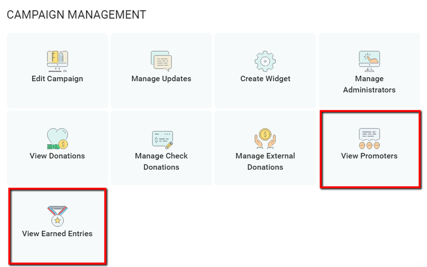 - View earned entries: See a list of all the bonus entries that have been issued to both promoters and donors.