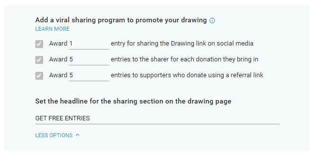 Viral sharing is a feature that helps you attract new donors and increase donations by motivating your supporters to promote your campaign. As a reward for sharing and bringing new donors to your campaign, they can receive free bonus entries for themselves.