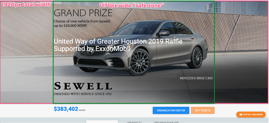 Although 1920×730 is the recommended image size for the advanced design option, your fundraising page is also responsive. This means that it automatically adapts to the size of screen the person is viewing it on. For screens smaller than 1920×730, images will be cropped on the sides as the site “responds” to the size of the screen. This is done to retain the overall look of the page (including your buttons, title, countdown timer, and more) on a wide variety of screen sizes, including mobile phones, tablets, and most desktop screens.