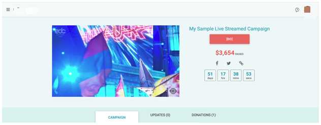 Regardless of which banner type you have chosen (simple or advanced) the live stream will show as above. Once the live stream has ended, your campaign page will return to its original setup.