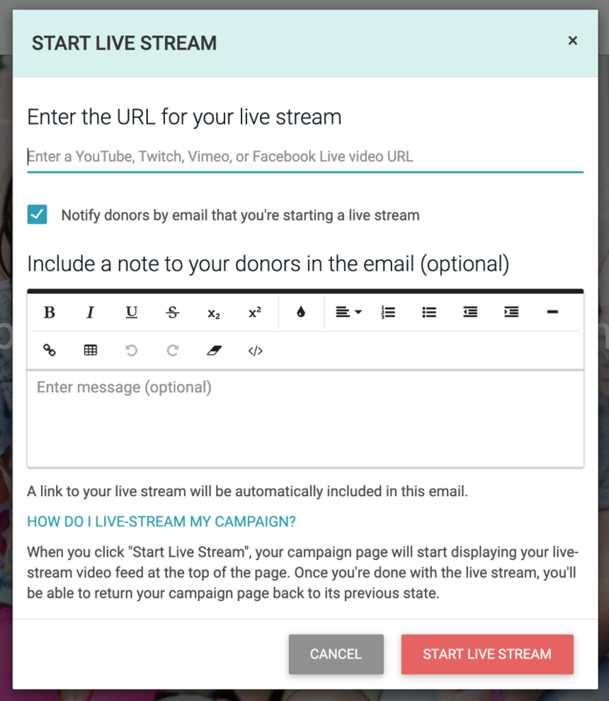 When you start any live stream, you can opt to automatically send an email to your supporters, donors, and anyone else participating in the campaign to let them know a live stream is starting.