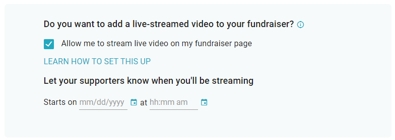 - Check the box next to ‘Allow me to stream live video on my fundraiser page.’