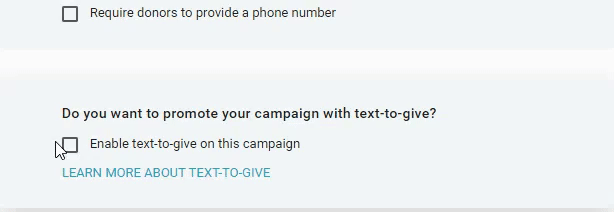 - On the second page of campaign setup (the title will be the campaign type), scroll down to the text-to-give card.